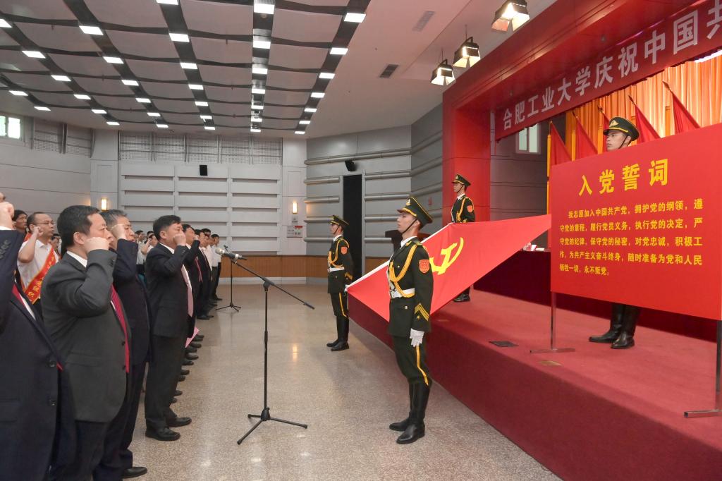 大会在雄壮的国歌声中开始,与会人员全体起立,齐声高唱国歌。在余其俊的领誓下,新党员代表在党旗下庄严宣誓,校领导和在场全体共产党员重温入党誓词。全体党员同志面向党旗,举起右拳,庄严宣誓。