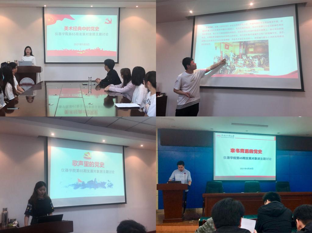 4月28日至5月10日,仪器科学与光电工程学院第65期入党发展对象班在科技楼236报告厅、225会议室开展了“歌声里的党史”“美术经典中的党史”“家书背后的党史”系列主题讨论。讨论会由发展对象班班主任李诗媛老师主持,本科生、研究生发展对象班全体学员共79人参与了此次讨论。