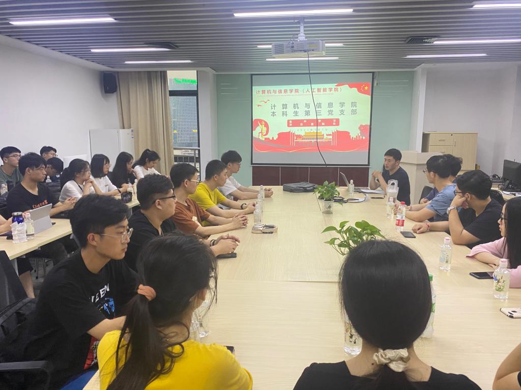 7月7日晚19点在翡翠科教楼A902会议室,计算机与信息学院(人工智能学院)副院长、党委委员洪日昌深入学院本科生第三党支部开展联学导学活动,支部全体党员参加学习。