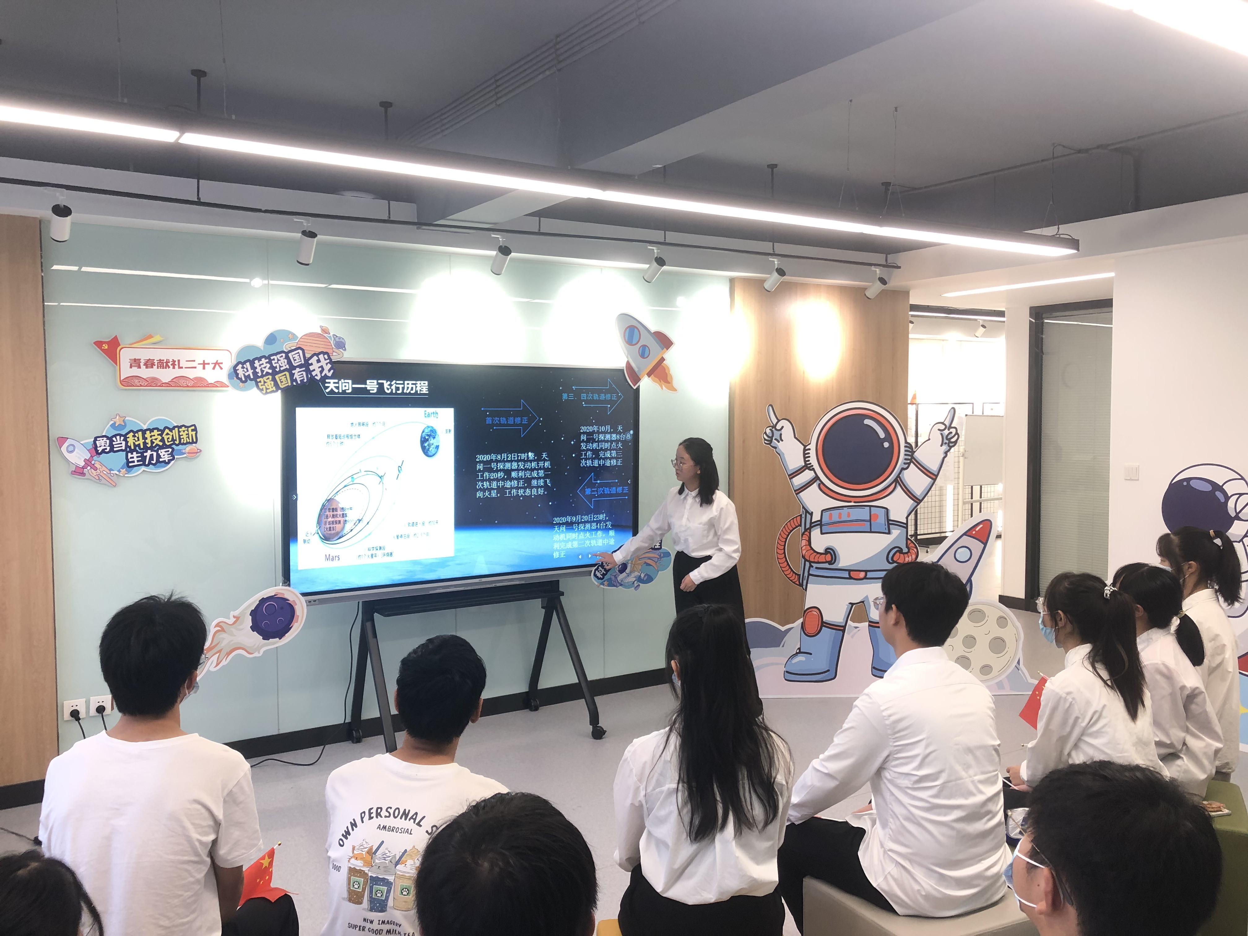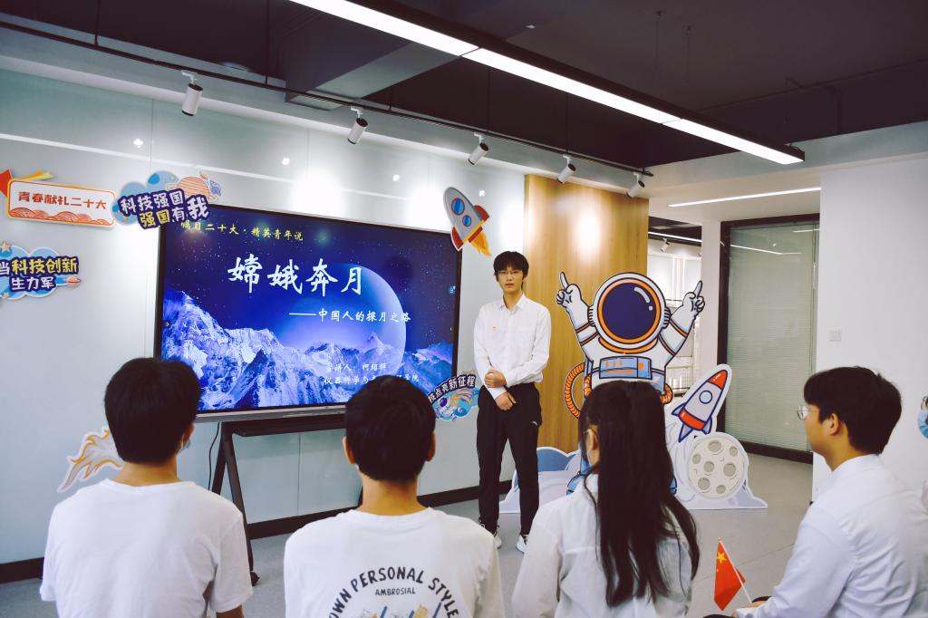 精英青年展风采,讲述科技强国史。宣讲团成员柯绍辉同学以“嫦娥奔月——中国人的探月之路”为题,讲述了中国人自古以来望月、奔月的美好愿望和我国科研工作者潜心研制“探月工程”、顺利实现载人登月的破冰历程,介绍了余有龙教授团队深耕钻具研究7年、助力嫦娥五号钻采取样的科研故事。史娟同学以“天问一号——中国第一次自主火星探测任务知多少”为题,介绍了首次火星自主探测工程的发展历史、飞行任务、飞行历程和重要意义。“‘天问一号‘成功登上火星,并且在一次任务中就完成环绕火星飞行、火星软着陆以及火星表面巡视,这是世界航天史上绝无仅有的,是中国航天事业发展中一个具有重要意义的里程碑!”她骄傲地说道。