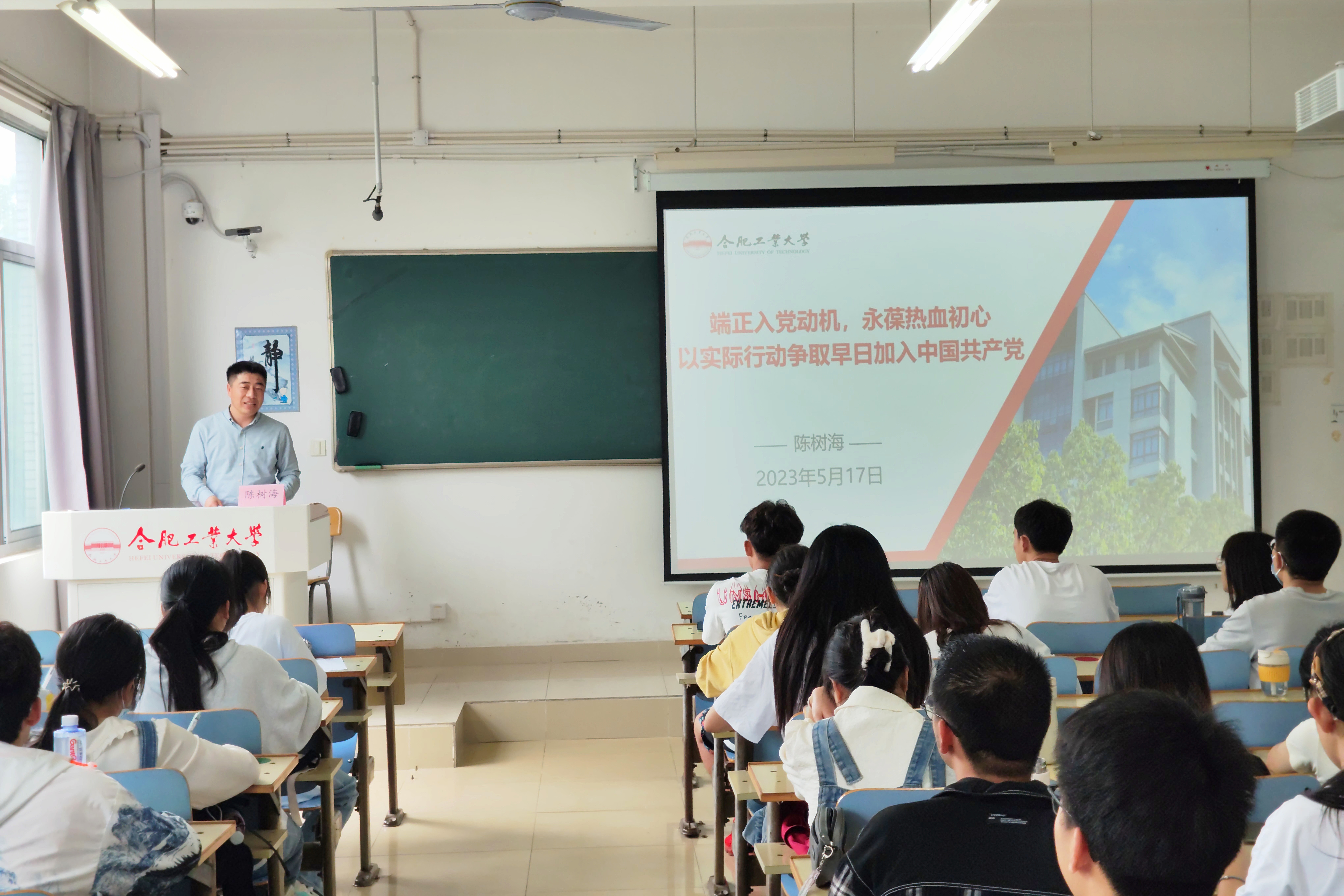 为推动学院学生深入学习贯彻习近平新时代中国特色社会主义思想和党的二十大精神,全面落实“学思想、强党性、重实践、建新功”的主题教育总要求,5月17日,食品与生物工程学院在翠十一教206开展“端正入党动机,永葆热血初心”专题党课,此次党课由学院党委书记陈树海主讲,学院分党校第69期积极分子班和预备党员班全体成员参加。