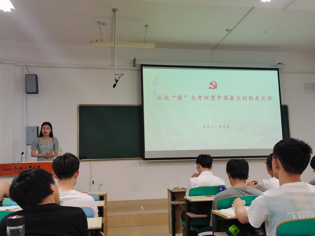 马克思主义学院研究生李秋晨的宣讲主题为“从抗“疫”大考回望中国最大的制度优势”。她首先分享了自己在疫情防控中参加志愿活动的经历与感受;接着讲述了抗击疫情的“中国速度”和抗击疫情的“中国保障”,最后分享了疫情常态化之下新的形势与挑战。