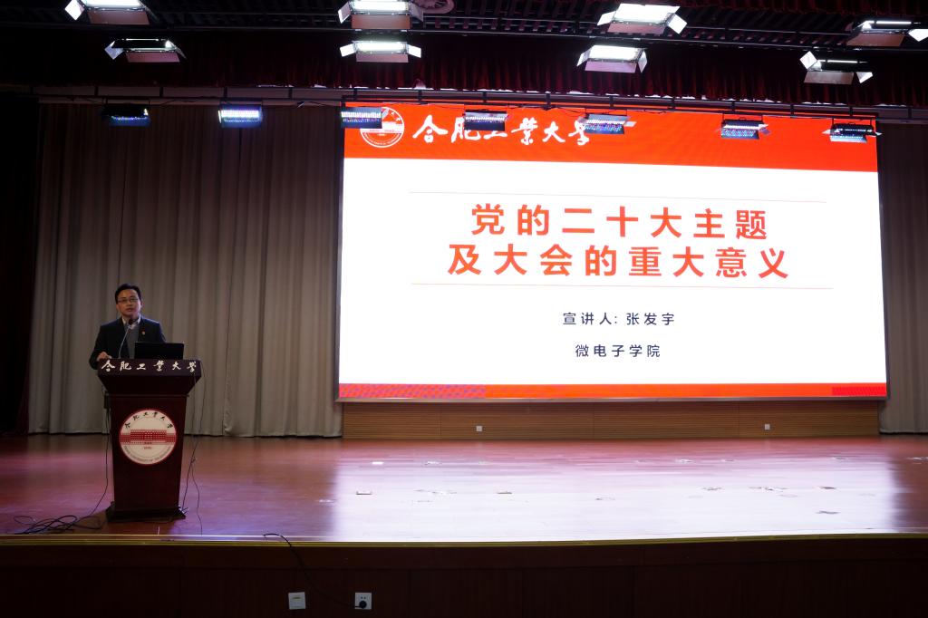 张发宇老师以《党的二十大主题及大会的重要意义》为题进行宣讲。他从党的历次代表大会概况引入,讲述了他对于党的二十大主题的见解以及党的二十大重要意义。他提到,党的二十大是迈上全党全国各族人民全面建设社会主义现代化国家新征程、向第二个百年奋斗目标进军发的关键时刻召开的一次十分重要的大会,大会召开的时间节点和时代背景非常重要而特殊;大会充分彰显了“两个确立”的决定性意义,取得了一系列具有长期指导意义的重大理论和实际创新成果,科学回答了“以党的自我革命引领社会革命”这一重大历史命题。最后,他勉励在场学生要从“学习方向”“学习规律”“学习目标”“学习互助”和“学习节奏”五个方面提高自身,敢于刀刃向内,有力量有温度地茁壮成长。
