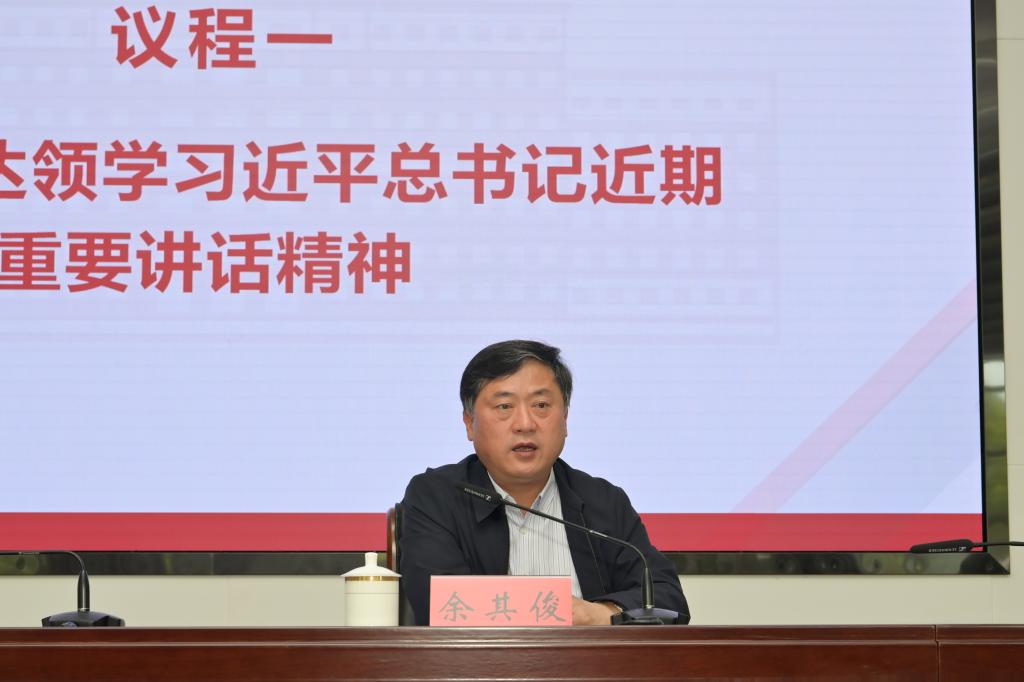 在集体学习环节,余其俊传达领学了习近平总书记在主题教育工作会议、二十届中央财经委员会第一次会议和4月28日中共中央政治局会议上的重要讲话精神,传达了习近平总书记给中国农业大学科技小院学生的回信、致全国广大劳动群众的节日祝贺和诚挚慰问精神等。