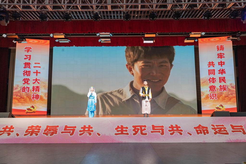 展演在欢快的歌舞《父亲的草原母亲的河》中拉开序幕。活动共三个篇章。第一篇章以“踔厉奋发,奏响百年伟业最美旋律”为主题,在该篇章中,回族学生马荣伯和海文香以《那片沙海是咱的家》为题,深情讲述了家乡各族人民在中国共产党的带领下从实现脱贫攻坚到乡村振兴的沧桑巨变;朝鲜族学生方心以《脱贫路上绽放民族之花》为题,讲述了以黄文秀为代表的各民族人民奋发向上,奋勇向前的脱贫故事;哈萨克族学生木力德尔·哈能以《红星》为题,讲述了已故帮扶干部王红星同志带领新疆青河县人民赢得脱贫攻坚战的故事。
